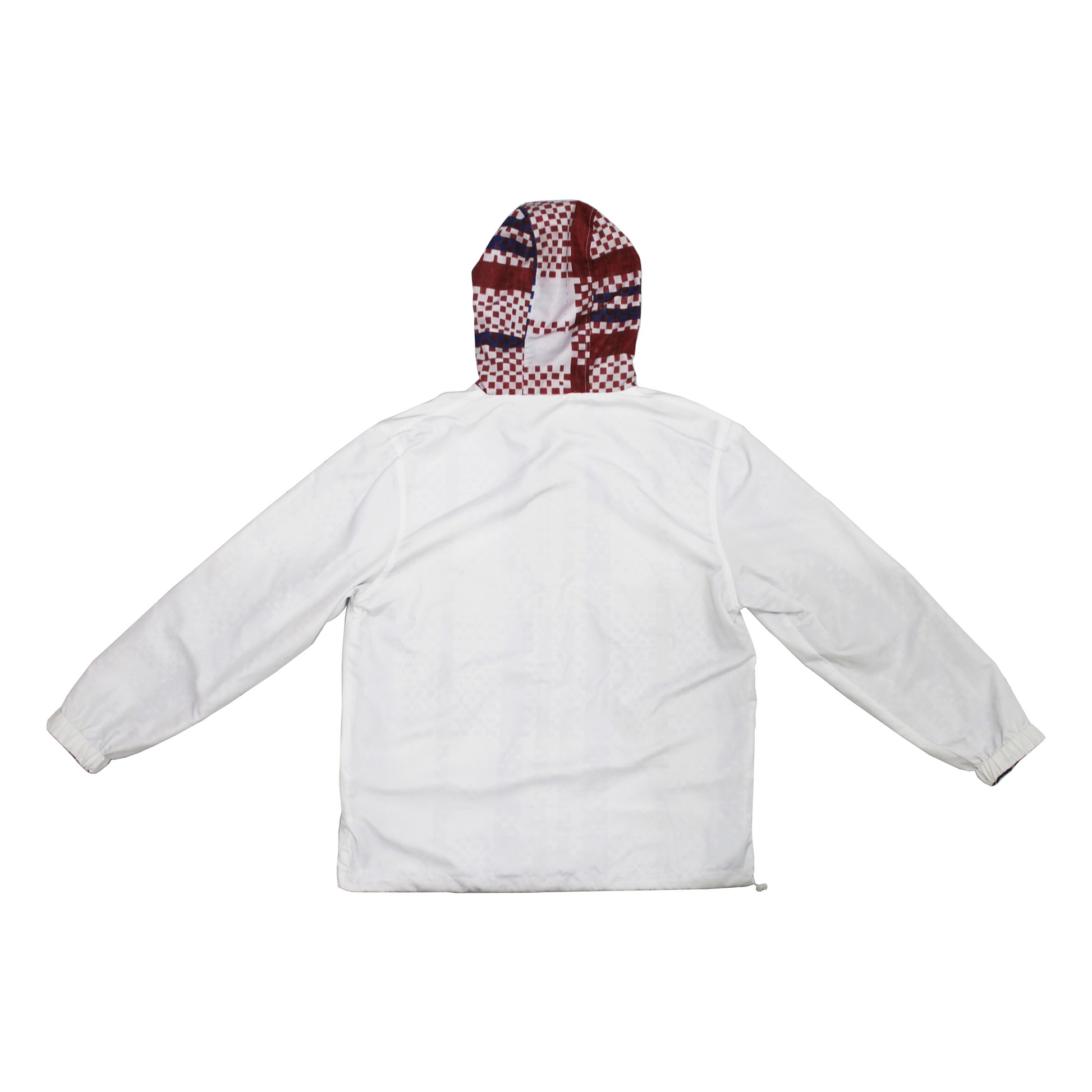 This reversible windbreaker has pockets on each side along with drawstrings for the hood and waist. This jacket features a Geminus logo on the chest and a large 2 on the back of the reversed side. The hood and reversed side of the jacket features a print based on travel bags used in Ghana.
